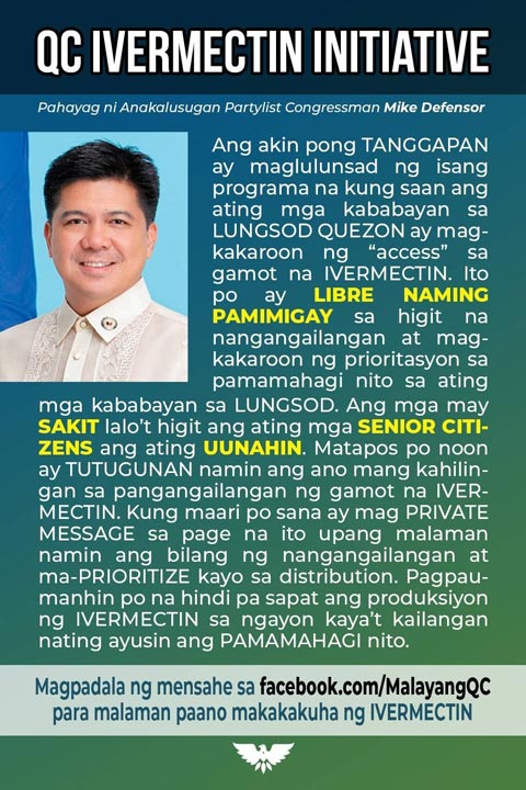 Yesterday, Anakalusugan Party List Rep. Mike Defensor announced on Facebook that he will give away the anti-parasitic drug Ivermectin to Quezon City residents, prioritizing senior citizens and those who are sick. But this initiative, which is meant to curb the spread of COVID-19, was met with public criticism. Many pointed out that there is no strong scientific basis for using it as a treatment against the virus.