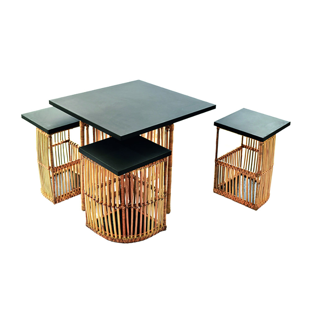 The Bakuran coffee table with pull-out chairs is a fine sample of flexible design, with stools that can function as seats, occasional tables or display stands.