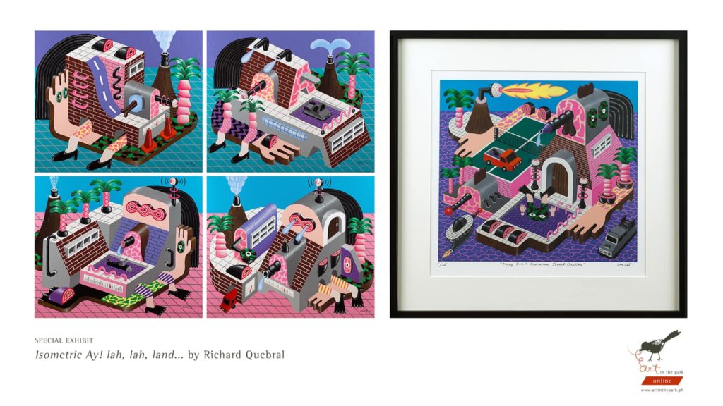 This year’s Special Exhibit Artists include Richard Quebral with his work depicting humorous stories about his family and home through pastel colors, grids, and textures; Dex Fernandez, bringing his alter ego Garapata to this year’s art fair, which harkens back to his childhood memories of the namesake tick in his art. Growing up with a number of pets, the insect was a prominent image in his years and has manifested it in his art as an ‘infestation’ in public spaces, design objects, fashion accessories, and new media. Other special exhibits feature the work of renowned children’s book illustrator Robert Alejandro; and watercolor artist and calligrapher, Reena Gabriel.