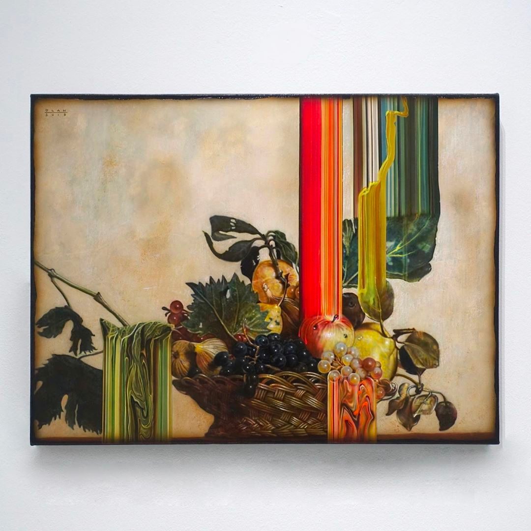 Olan takes inspiration from the still life paintings from the 17th century. He paints with the tradition of extravagance but incorporates modern elements like striking glitches. His interest in technology, pop culture, and identity reflects in his unique interpretation of classic paintings. Among his works is a rendition of Jan Davidsz de Heem‘s Vase of Flowers. With a dripping technique, Olan seemingly pulls off the flowers, grapes, and lobsters off the canvas. As Yavuz Gallery explains, “[Olan] taps art historical references and the processes of today’s digital technology in image reproduction to add more layers of visual engagement in his pieces.” The result is a distorted image of elements, stretching into multi-colored linear lights that resemble beautiful printing glitches.