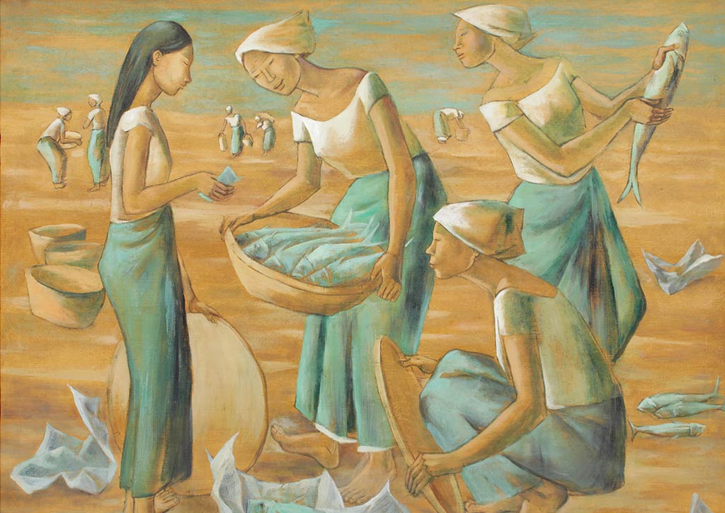 The “Queen of Auctions,” Anita Magsaysay-Ho, returns for another possible record-breaking feat with “Fish Vendors.” According to Leon curator Lisa Guerrero Nakpil, it “is a work from the rare series first created in 1975 that introduces a single bare-headed woman among Magsaysay-Ho’s recognizable bevy of females wearing kerchiefs over their hair.”