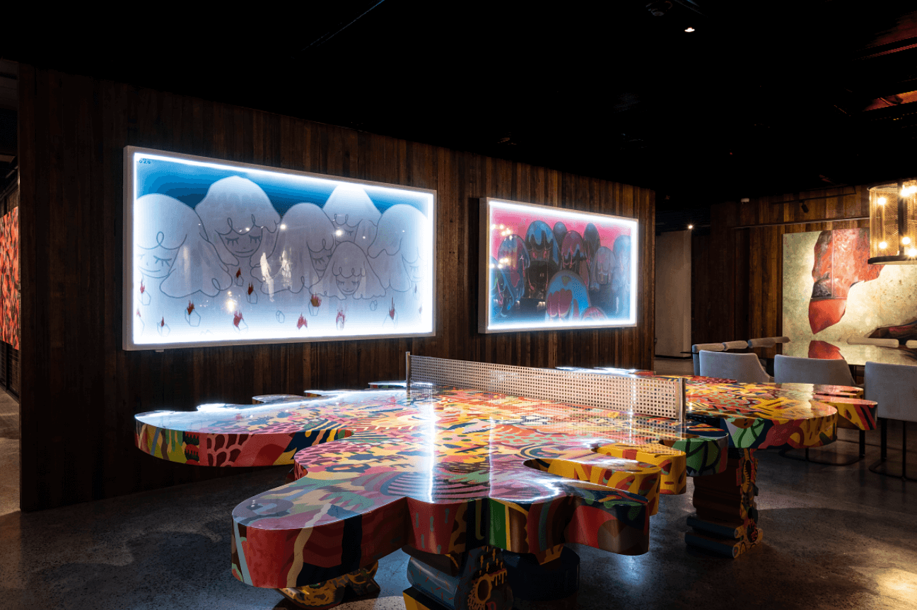 Moreover, the couple thoughtfully considered the needs of their guests, who are welcome to bring their kids to the gallery. Younger visitors can use artist Louie Cordero’s outrageous pingpong table or the Polycade Lux arcade machine mounted on the wall, as their parents play a game of mahjong with artist Josephine Turalba’s set while tippling cocktails from the jewel-toned bar. “This space is also for entertaining,” explains the husband.