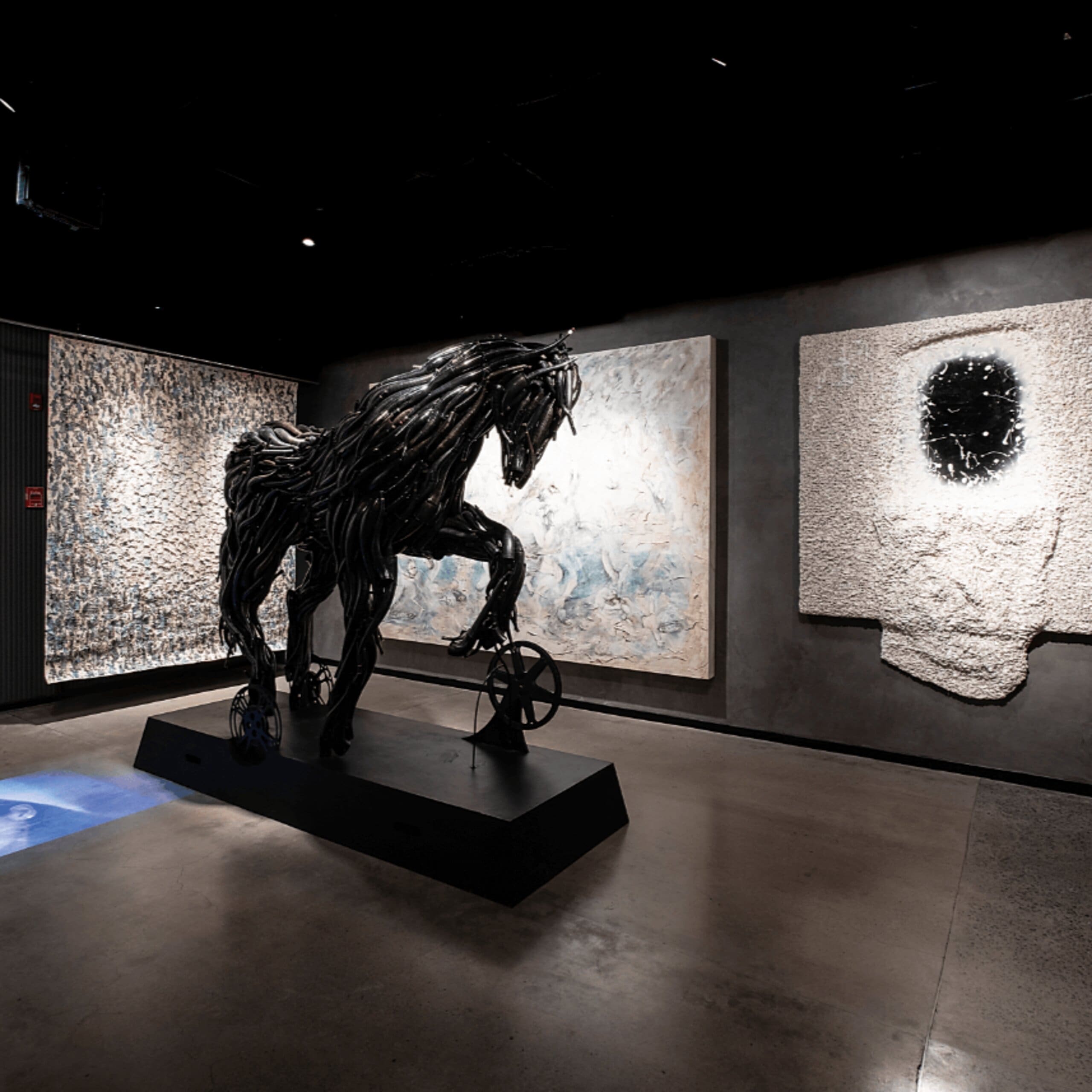 The pair created a space that exudes “industrial glamor” and houses the impressive collection of art pieces they’ve gathered throughout the years.