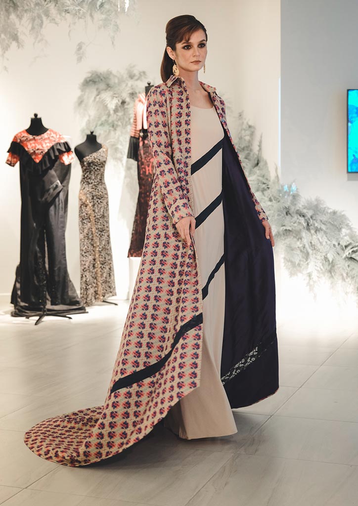 The capsule collection by Septième Rebelle using the Sansó textile designs is a nod or a curtsy to the revival of fashion after the second world war, which was the time a young Juvenal Sansó made contributions to fashion as a designer for fabric houses and ateliers overseas; and to the hopeful resurgence of high fashion after limitations set by debilitating lockdowns.