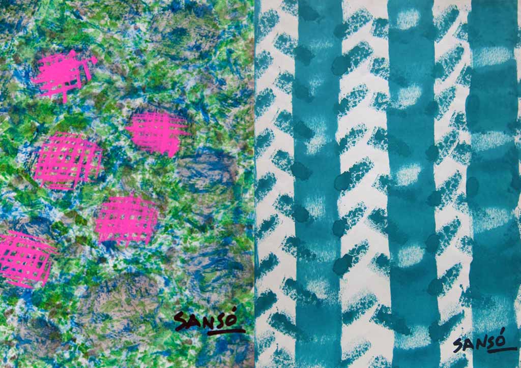 Drawing from Sansó’s work wasn’t easy for Santos. He had to take two different paths for his new collection. First, the process of digitally printing Sansó’s hand-painted original designs on fabric and making clothes from the printed fabric produced.