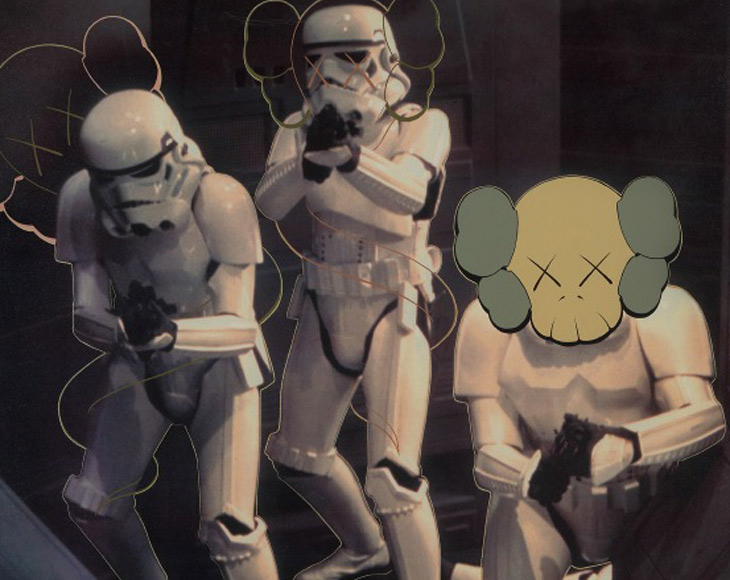 “One Stormtrooper’s face is covered with the distinctive flat cartoon-like mask formed from a piratical skull and crossed bones, each eye socket crossed out with an X, symbols that have been consistently present in KAWS’s work over the years,” reads the description in the Phillips website.