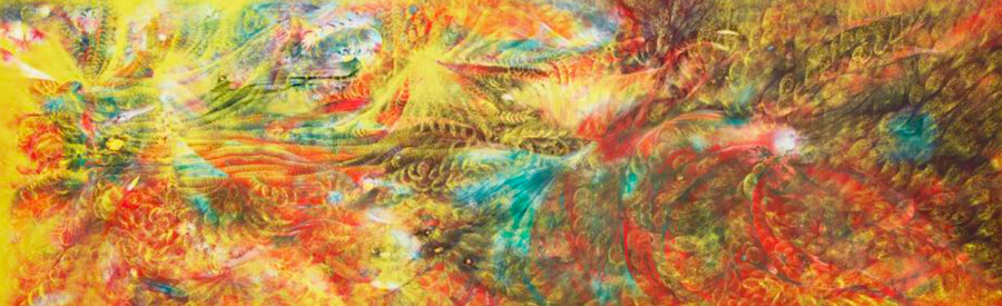 In “Transparent Female Forms,” a kaleidoscope of jewel-like hues emerges from a neutral ground, superimposed with gestural improvisations that lend the work a sense of rhythm invoking Condo’s preoccupation with music, which he studied alongside art history in university.