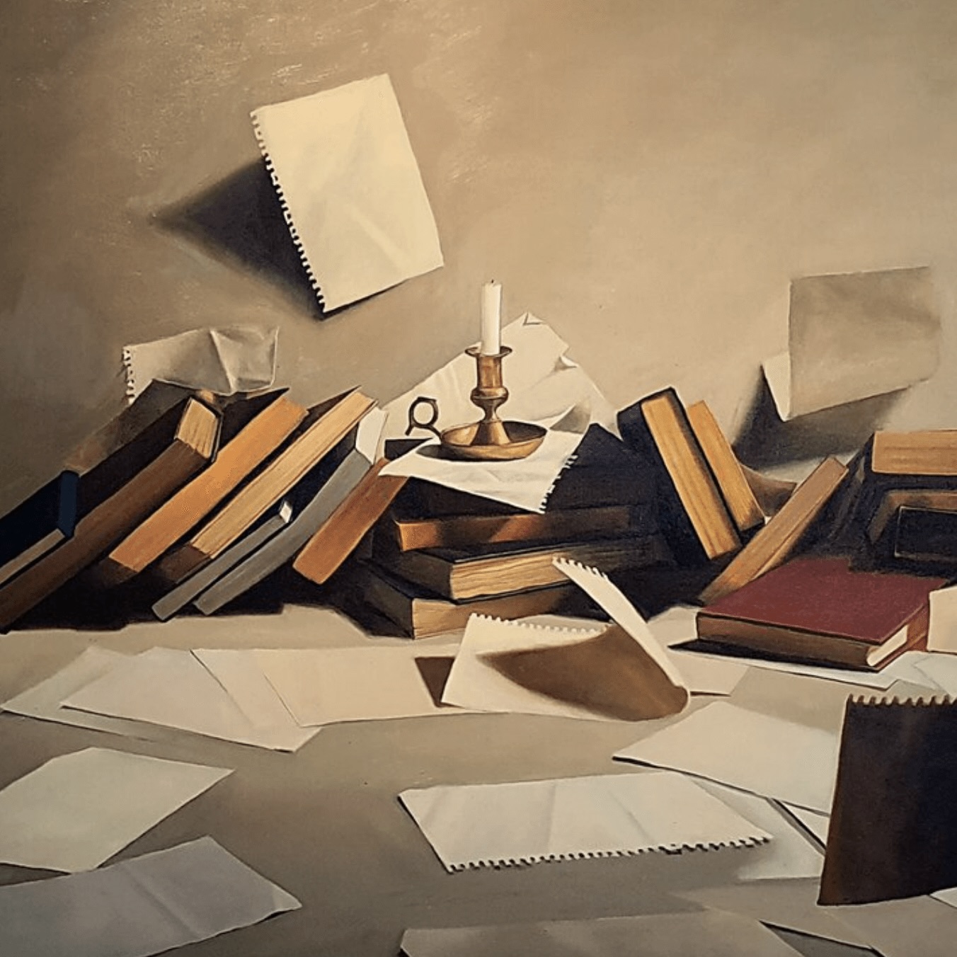 With a calm and disciplined approach, Theodossis paints collections of books and loose pages, all blank and unwritten, symbolizing the many people whose stories she hopes were written, shared, or at least heard.