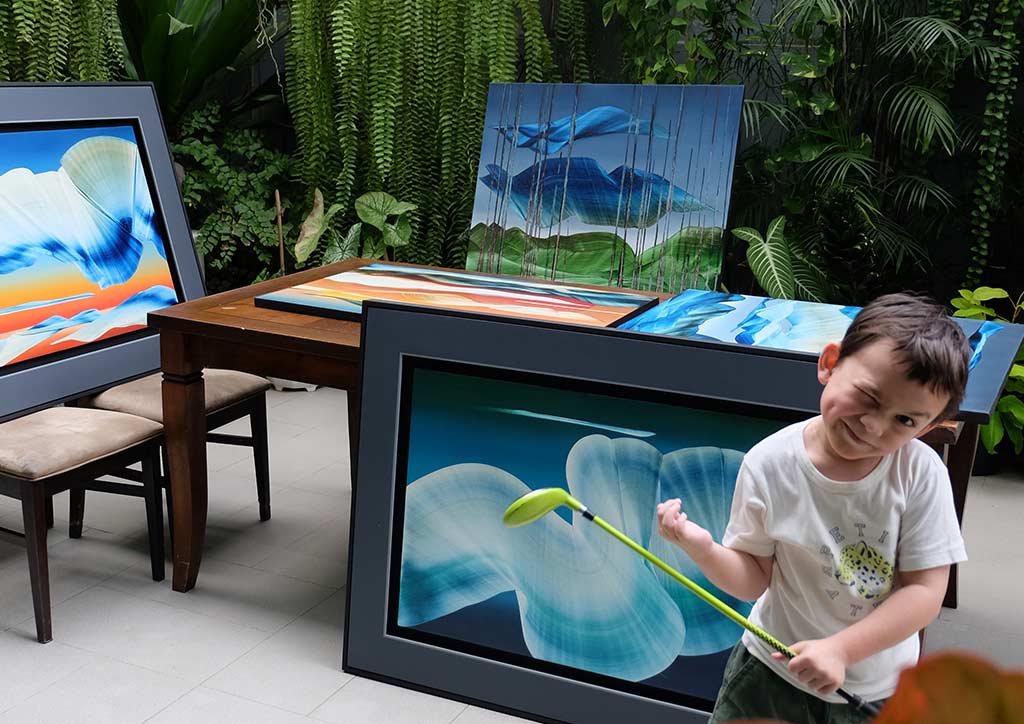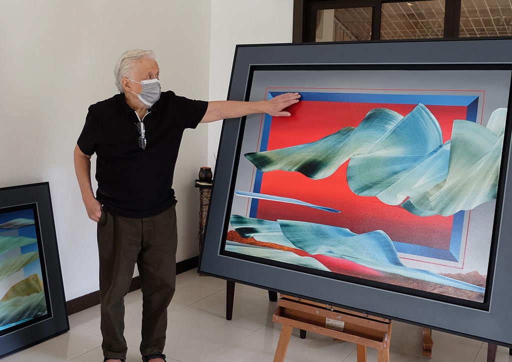 “If you look at the works for the show, a lot of them have the square form, like a frame within a frame which I used to do when I was still young, during the 70s.” he says. “That’s from the past. Then I incorporated newer elements, like the flowing forms.”