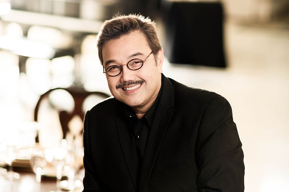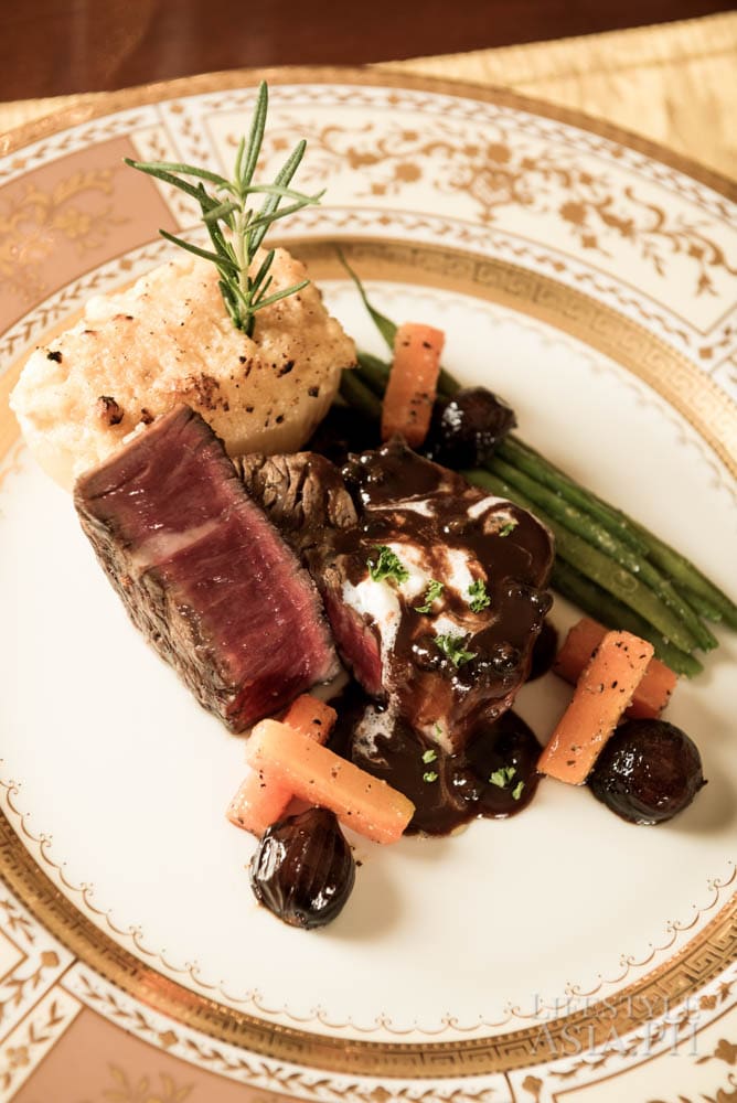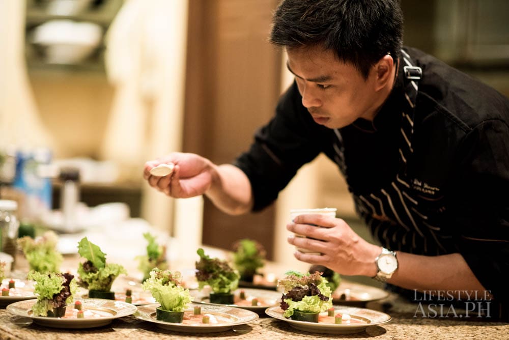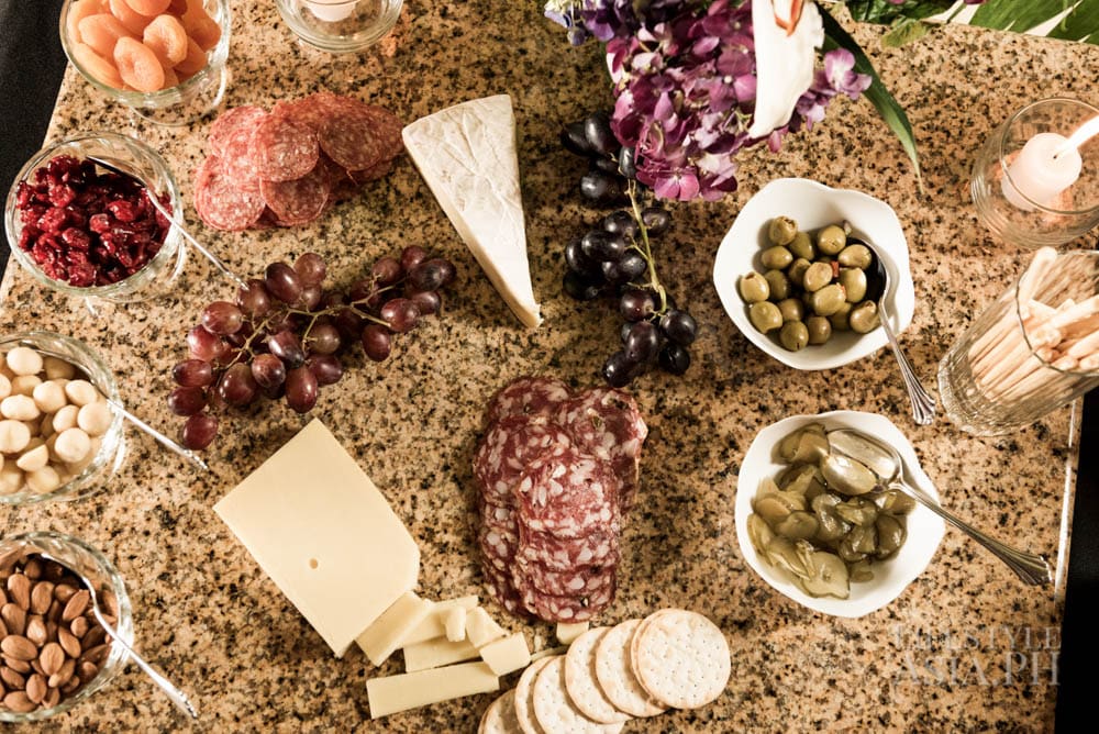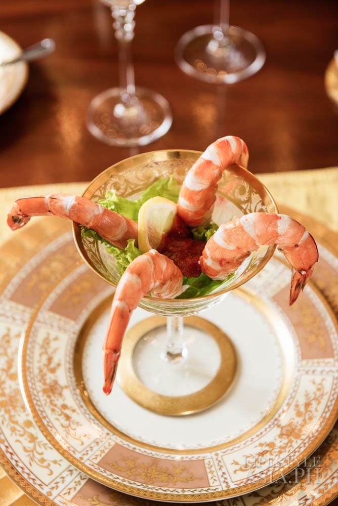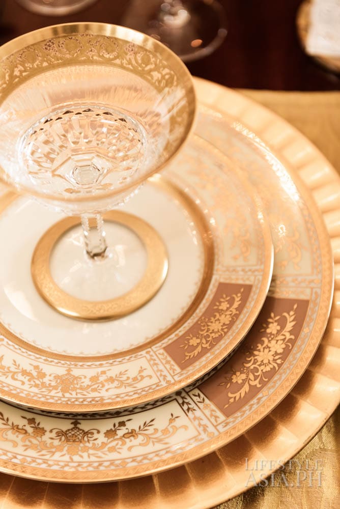 Inside the kitchen, Chef Innan Soriano of the Tower Club prepares an eight-course meal. Innan’s assistant chef, Lance, and headwaiter William are experts working behind the scene who make Ito’s dinners exceptional. “William knows our style. He knows where things are and we trust him. He is a banquet waiter and we usually just text him. If he’s free, he shows up!” says the host. Ito’s table settings are often unusual. He will create a setting without linen tablecloths “just because.” He also does the floral arrangements himself. Having owned several flower shops in the past, Ito has developed an interest and knowledge on how to create centerpieces that are unique.