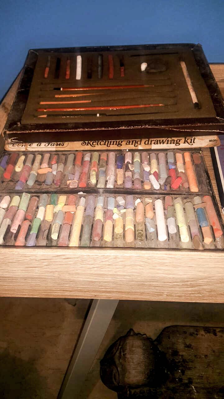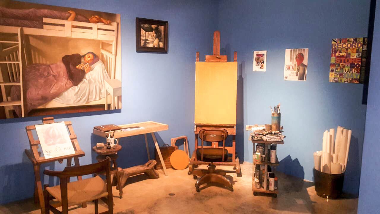 A few steps away is Elmer’s work area as it might be in their house. The artist’s studio has blue walls, an easel and a canvas with worktables holding the paints and brushes on one side, and the chalks and drawing pencils on another. All the furniture are made of wood, including a dog footstool. A painting hangs on the wall showing the couple sleeping on a double deck bed with Plet on the lower level and Elmer above. It enhances the intimacy of the space.