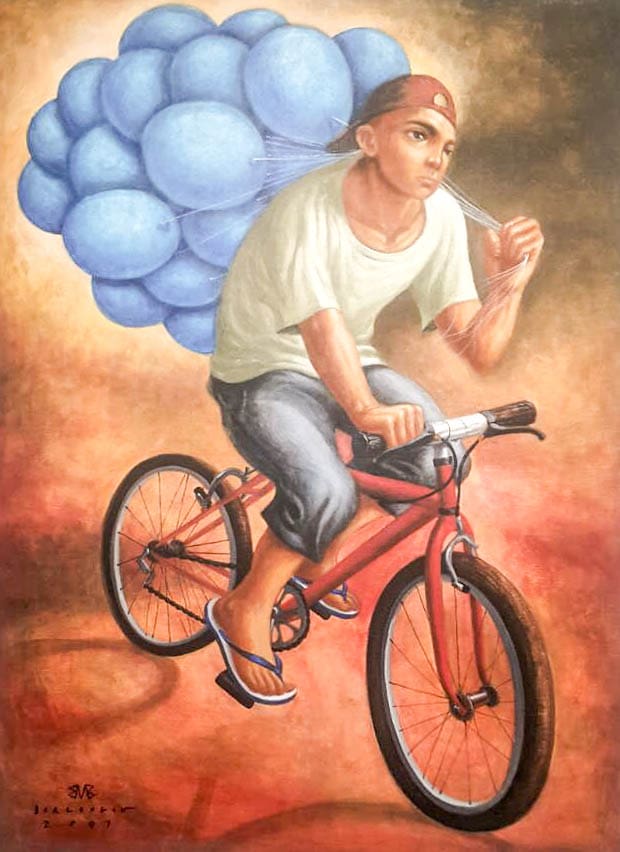 The social awakening of the then Fine Arts student in the University of the Philippines was already translating into his paintings. His canvases conveyed a social consciousness captured in representational figures framed within the life of common folk. Disfigured people with prominent eyes ride bicycles, sell sampaguita leis, carry layers of egg trays and ride on the top of a bus with unicorn clouds above. He is able to see the particular distinctly within the backdrop of everyday life from a very personal perspective. How appropriate that his exhibition is entitled “Extraordinary Eye for the Ordinary.”