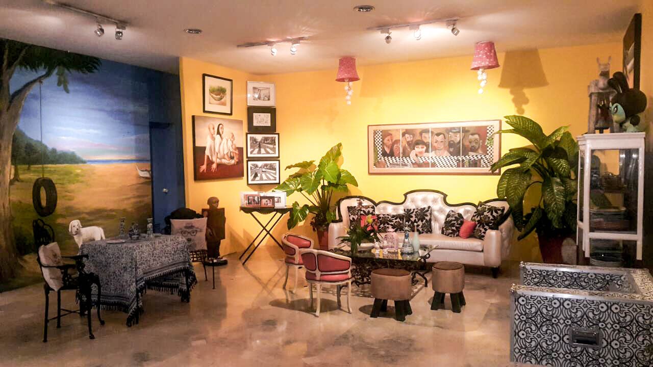 There was a living room set-up to the right of the main entrance of the museum. It was a recreation of Elmer Borlongan’s living room in the home he shares with his wife, fellow artist Plet Bolipata. Plet’s painting hangs behind the sofa under lamps with pink lampshades. There are a couple of peach colored accent chairs, two round stools and a coffee table with ceramic figurines that assumedly are part of their home décor in San Antonio, Zambales. Verdant potted plants suggest the lush greenery surrounding their residence in the sprawling Bolipata family property. Elmer and Plet’s framed photos hang on the yellow walls and stand on a folding side table, adding to the sense of being in their personal space.