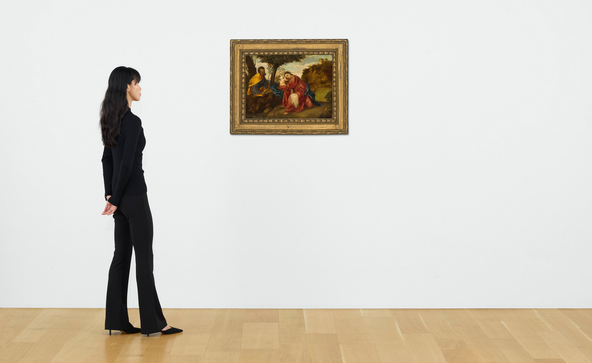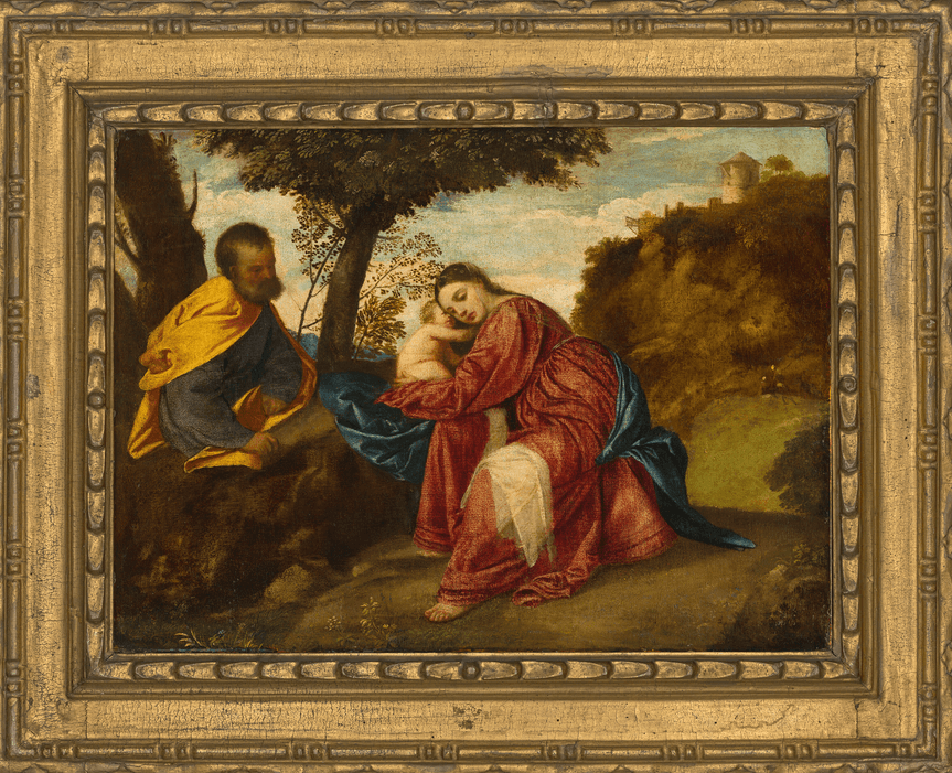 Entitled “The Rest on the Flight Into Egypt,” the 18 ¼ x 24 3⁄4-inch oil painting depicts the Virgin Mary with her husband Joseph and an infant Jesus. With bucolic surroundings, it depicts the family experiencing a moment of respite during a trip to Egypt. As Christie’s writes in a press release, it references a Biblical account where Joseph receives a warning about King Herod of Judea’s plans to kill the young Christ, and decides to take his family to Egypt for their safety.