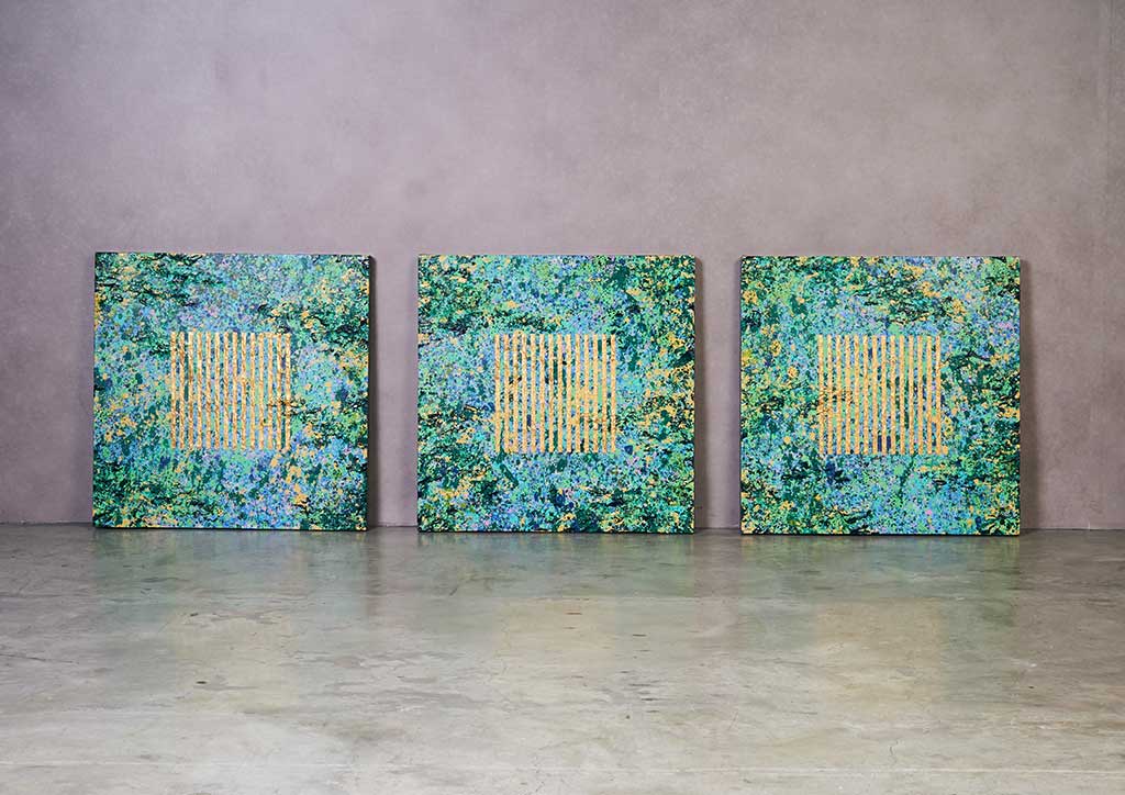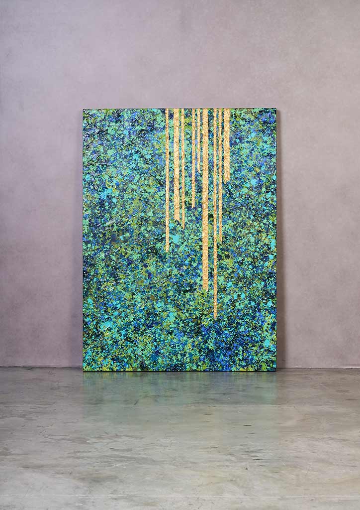 These works are an “attempt to display a consciousness in our surrounding environment, and how the viewer constitutes their place in the world of nature. The result is an exhilarating display of energy and serenity, with exuberant use of nuanced color in the schema of foliage, sea, and space.”
