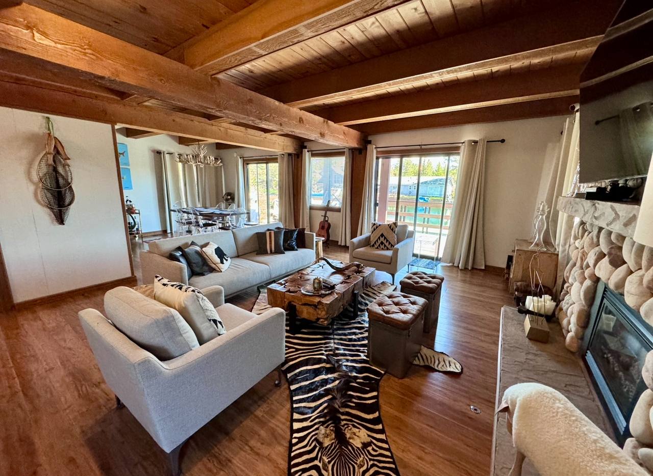 A crucial element of my Lake Tahoe home is my teak wood stump coffee table, serving dual purposes: as a comfortable rest for feet during TV sessions, and as a display space for unique items purchased during my travels, including an African Buffalo Horn and a fossilized wood tray acquired in Bali.