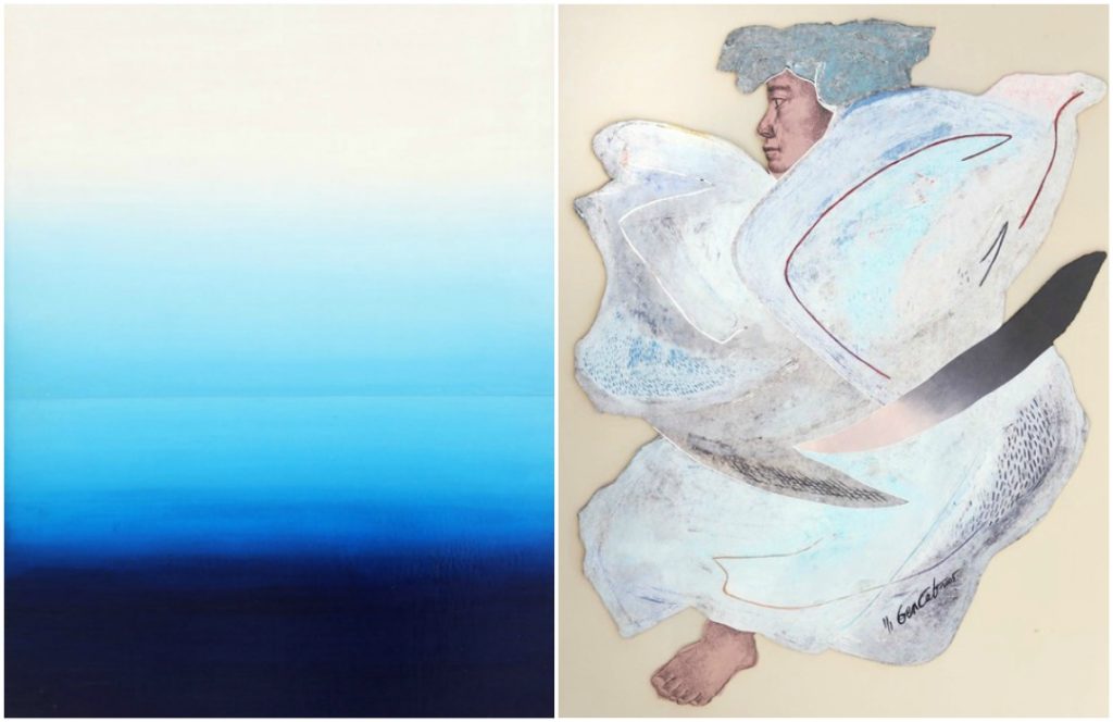 All Blue No. 3 by Lee Aguinaldo, signed and dated 1992; acrylic on marine plywood; 32” x 19” (81 cm x 48 cm) and Man – Mono III by Benedicto Cabrera, signed and dated 2005; woodcut, collagraph, and etching on STPI handmade shaped paper, printed from 4 woodblocks and 2 copper plates; 65” x 50” (165 cm x 127 cm).