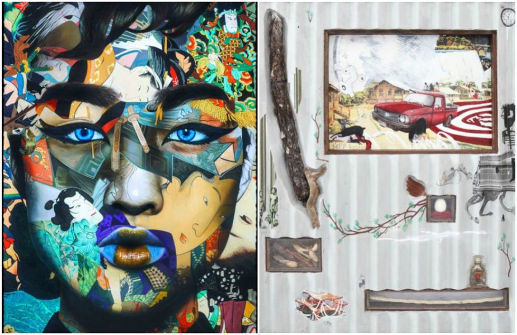 Loneliness Remembers What Happiness Forgets by Andres Barrioquinto, signed and dated 2019; oil on canvas board; 84” x 60” (213 cm x 152 cm) and Baguios Kultur Repprochment 1 by Kawayan de Guia, signed and dated 2010; mixed media; 47” x 39” (119 cm x 99 cm).