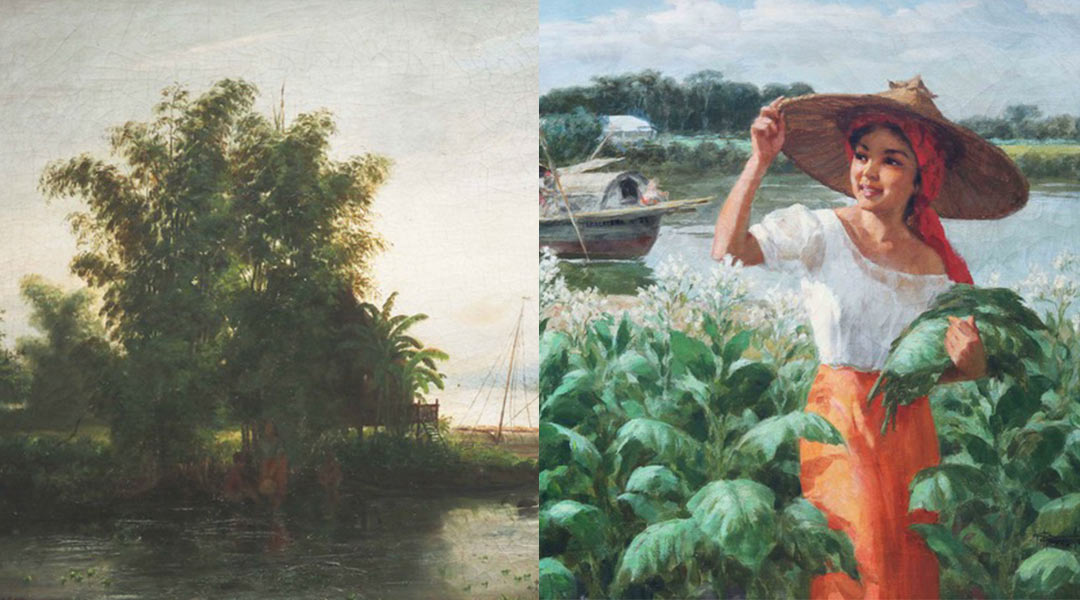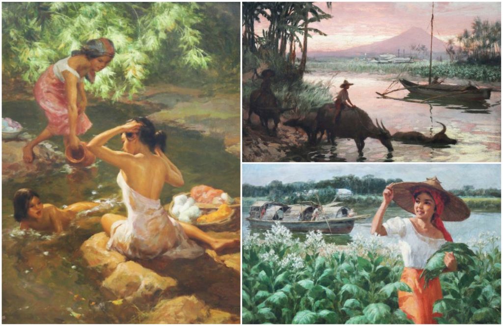 LEFT: The Bathers by Fernando Amorsolo, signed and dated 1953; oil on canvas; 37” x 29 1/2” (95 cm x 75 cm). TOP-RIGHT: Crossing the River by Fernando Amorsolo, signed and dated 1924; oil on canvas board; 12 1/2” x 16” (32 cm x 41 cm). BOTTOM-RIGHT: Tobacco Maiden by Fernando Amorsolo, Ca. 1938, signed; oil on canvas; 24” x 32” (61 cm x 81 cm).