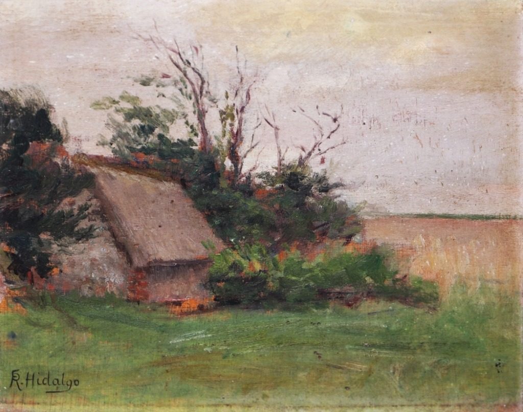 “A Farmhouse in Normandy” (7.5”x9.5”, oil on board, signed lower right c1900) by Félix Resurrección Hidalgo (1855-1913)