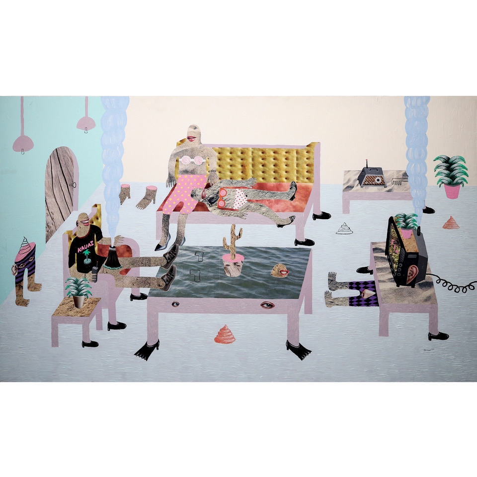 “Indoor Living II” (36”x60”, mixed media on canvas, signed and dated 2016 lower right) by Richard Quebral (b.1989).
