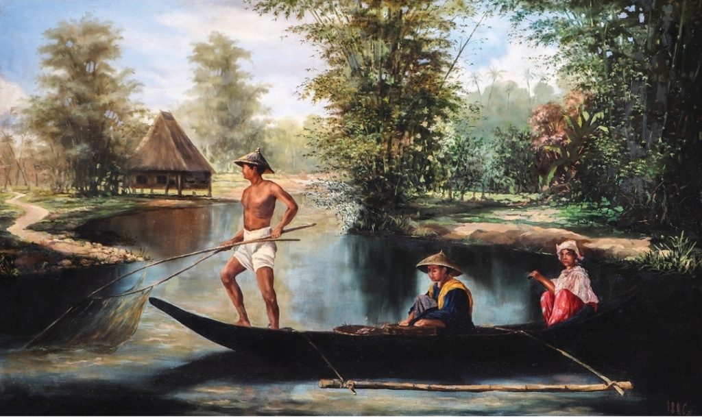 “After Hidalgo, El Pescador de Sucag” (26”x44”, oil on canvas, signed by Castellon and dated 1886 lower right)