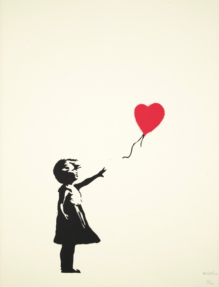 Another highlight by Banksy is “Choose your Weapon (VIP Gold)” (2010, estimate: £200,000 to 300,000), which will mark the first time a gold colorway of this work has come up at auction. The event is led by the artist’s most famous image “Girl with Balloon” (2004, estimate: £300,000 to 500,000).
