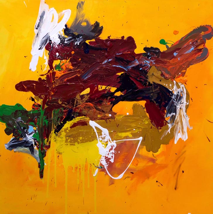 Montegrande employs a more cheerful tone for his abstract expressionistic works. This he executes by combining analogous and complementary colors, as well as in the texture created by heavy impasto.