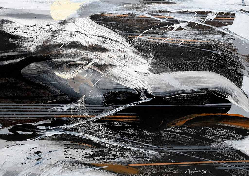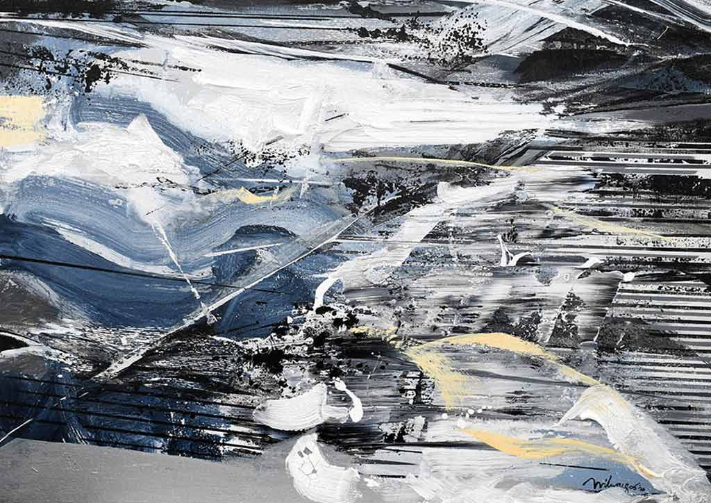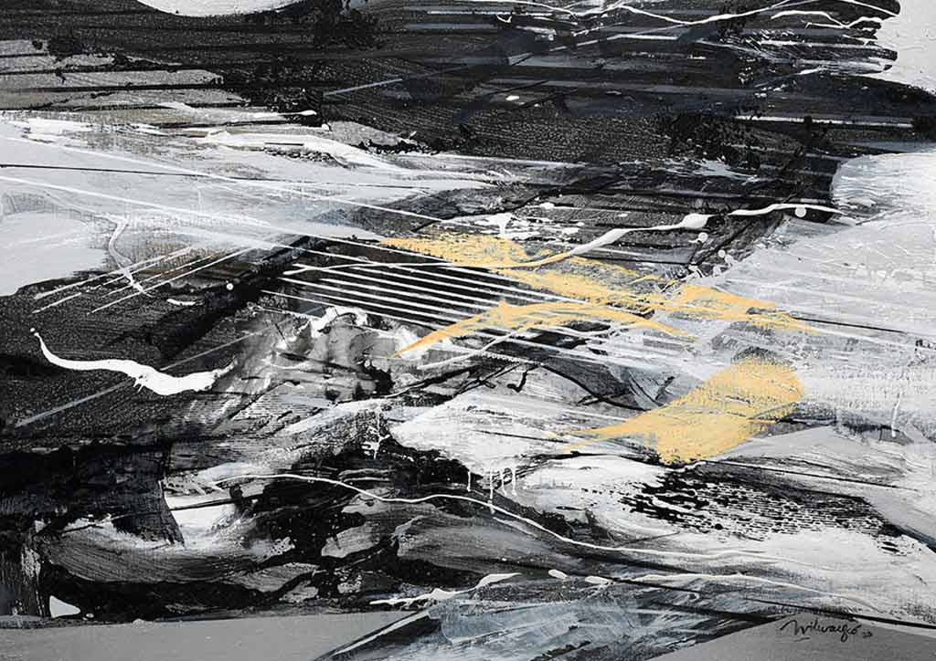 But the pieces, indeed powerful, do speak for themselves through a symphony of textures and tones, in variations of movement, flow and contrast. Each stroke suggests an emotional arc, or perhaps a crescendo or improvisation, that moved the artist while he was at work. Wilwayco purposefully used black, white, and a third color, as well as texture and movement, to communicate his theme for each painting he created.