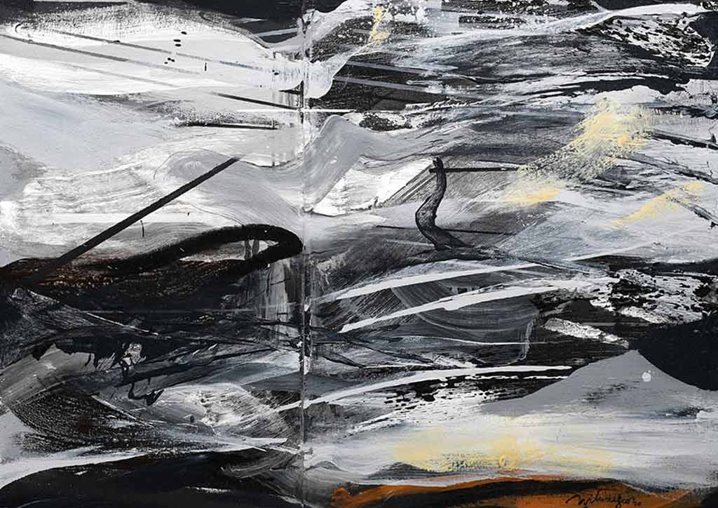 Of course, the themes are open to interpretation. Each painting has a distinct, seductive quality of its own. And for each piece, heavily painted dark surfaces serve as the stage for a myriad of strokes: light or heavy, upward or downward, sideways or diagonal, whole, broken, jagged or splattered, deliberate or subdued.