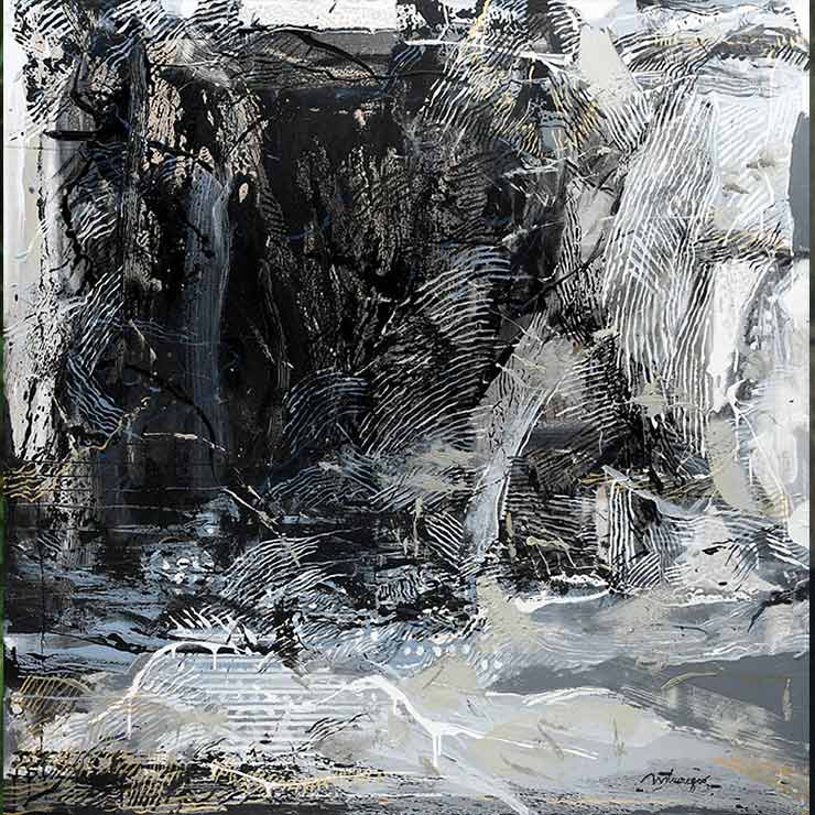 Of course, the themes are open to interpretation. Each painting has a distinct, seductive quality of its own. And for each piece, heavily painted dark surfaces serve as the stage for a myriad of strokes: light or heavy, upward or downward, sideways or diagonal, whole, broken, jagged or splattered, deliberate or subdued.