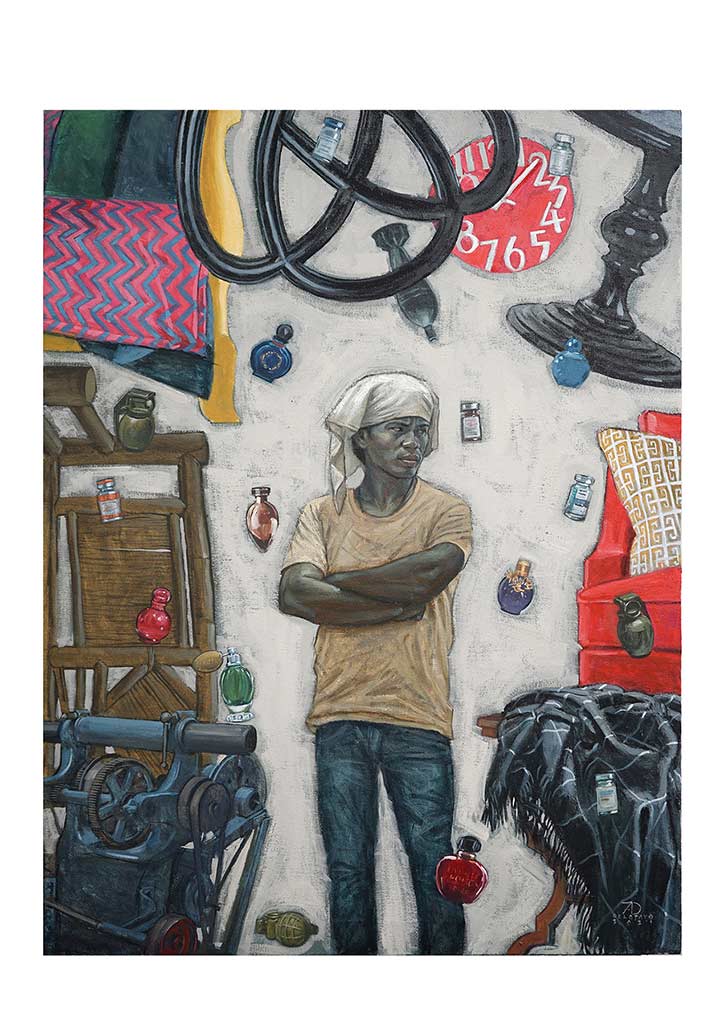In contrast to this, Phyllis Zaballero’s Window Whimsy #5 is true to its name. The work is a playful hodgepodge of neon colors and odd silhouettes straight out of a bygone era. Antipas Delotavo’s Elixir is another fanciful excursion from convention, which sees a man caught between a random assortment of floating paraphernalia: a sewing machine, perfume bottles, and a clock.