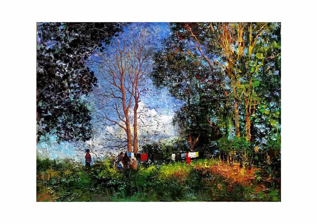 Orley Ypon’s Life and Nature is a snapshot of provincial idyll, with frenzied brushstrokes depicting otherwise tranquil pastoral beauty, a scene of traditional family life emerging in the background. Tammy de Roca’s Vergel’s Golt is a similar chronicle of the natural world in which she seizes the tumult of the sea in thick impasto waves.