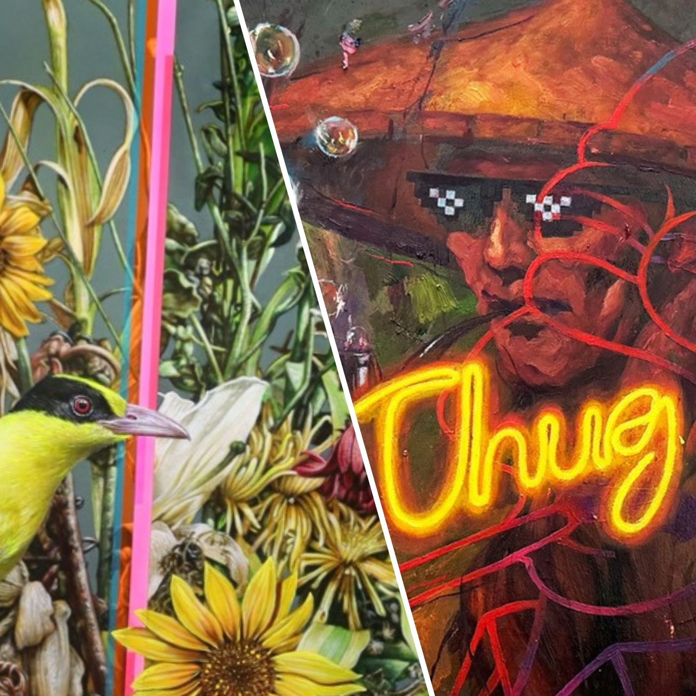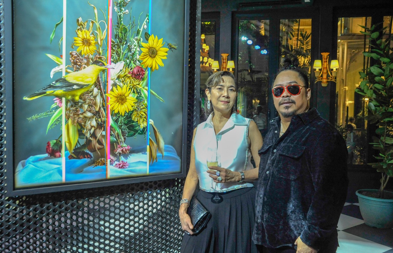 His series for the Goldenberg Mansion Art Series 2, entitled Prismatic Petals, blends classic and modern techniques to hold the viewer’s attention. Ostensibly, the works bear the hallmarks of traditional still-life paintings with their realistic, detailed depictions of various blooms surrounded by different birds found in the country, including the Eurasian sparrow (mayang simbahan in Tagalog) and black-naped oriole (kilyawan in Tagalog).