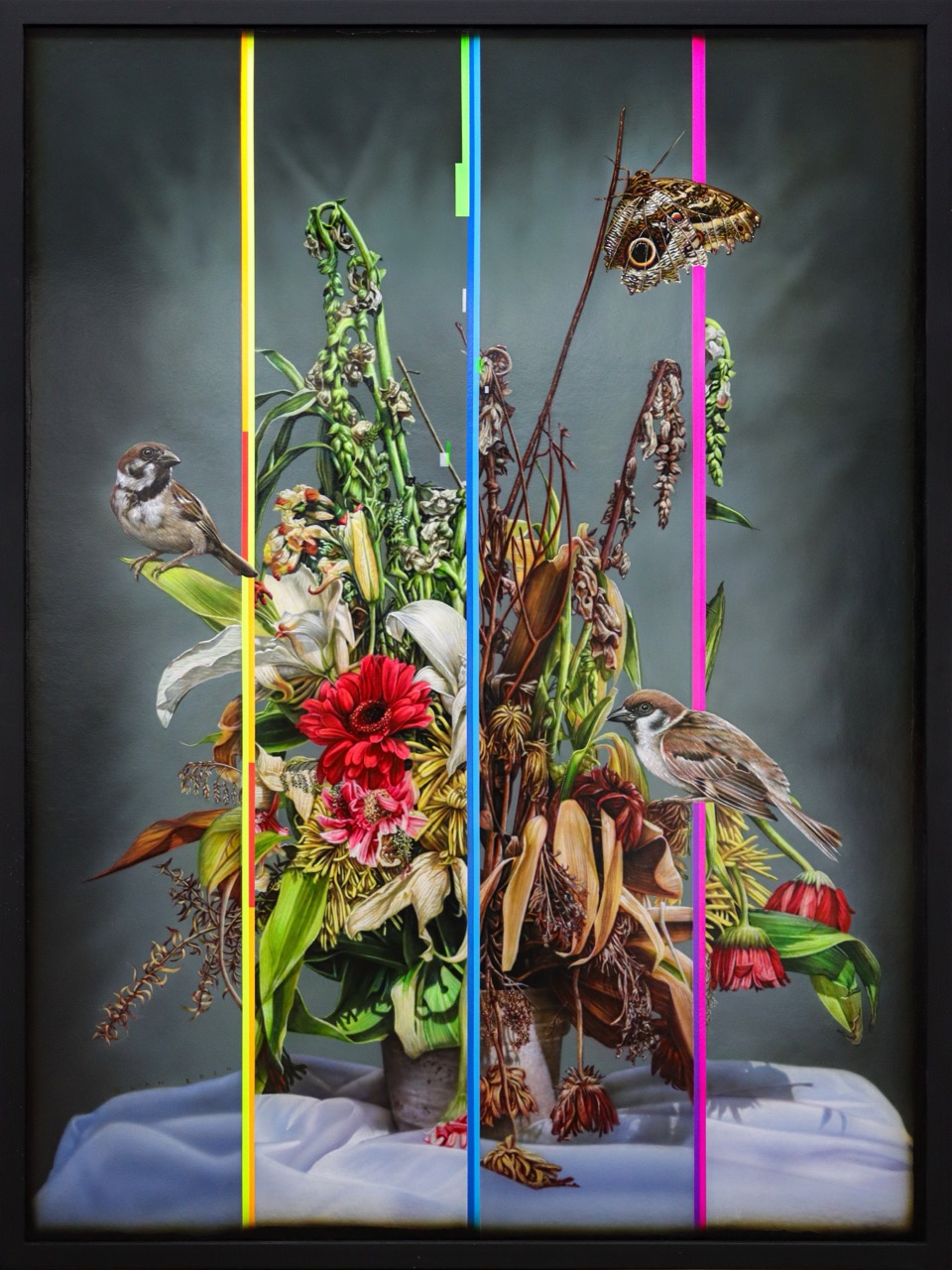 Yet Culibrina subverts expectations with bands of eye-catching, neon colors that evoke glitches of device screens, transposing a disruptive technological element into the traditional medium in a way that is nothing short of hypnotizing. Order is split with dashes and lines of chaos as Ventura illustrates the fragmented nature of contemporary existence, where beauty and order are continually interrupted by the chaos of technology and modern life.