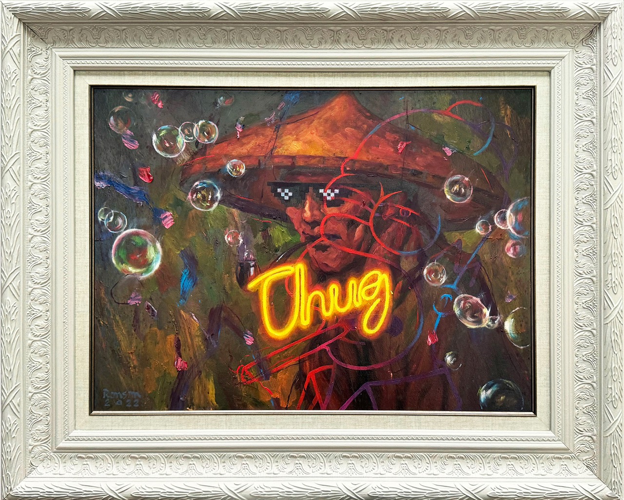 For Culibrina’s series entitled Marahuyo (loosely translated as “to be enchanted”), the artist offers a radically different, yet equally provocative, take on Filipino identity. One might recognize the colors and compositions of iconic works of Filipino artists in his latest collection, namely Fernando Amorsolo, which Culibrina has reinterpreted through the incorporation of modern, splashy, pop culture elements. Similar to Ventura’s approach, he disrupts and changes the time-old narrative of the idyllic and bucolic Filipino life that Amorsolo was known for depicting, creating new images that capture today’s zeitgeist.