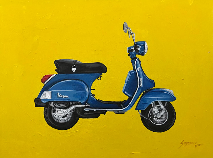 These works were created by hotelier and painter Michael Anthony Sagaran over the course of the last two years. The artist says he is a big fan of the scooter brand, both by its own historical merit that stretches back to the post-war era and its Italian roots.