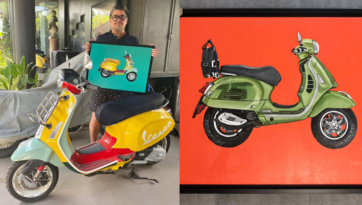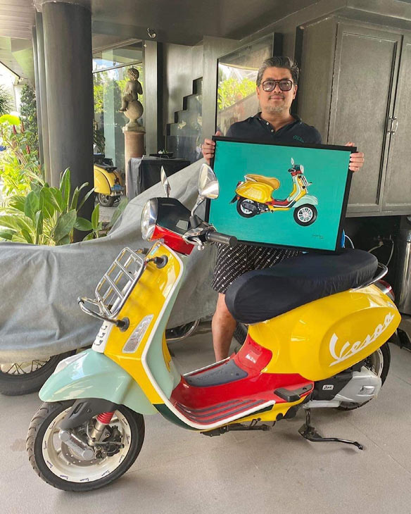 From left: Julius Babao with his Vespa Sean Wotherspoon (2020) limited edition and a painting of it by Sagaran; VESPA GTS 7th Anniversay Edition, 2021