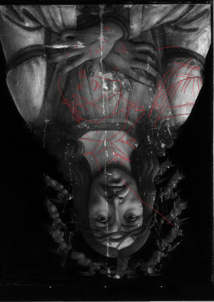 The renaissance painter’s “Man of Sorrows” was undergoing technical analysis ahead of its January 27 auction when it was discovered that there was an abandoned Eleusaor “Madonna of Tenderness” outlined beneath. Upside down, this outline was found under infrared scanning.