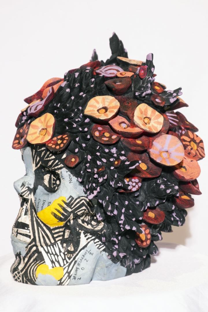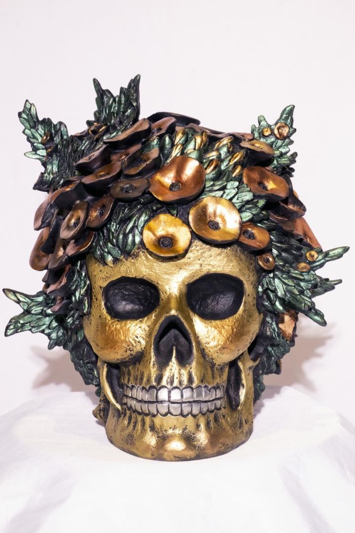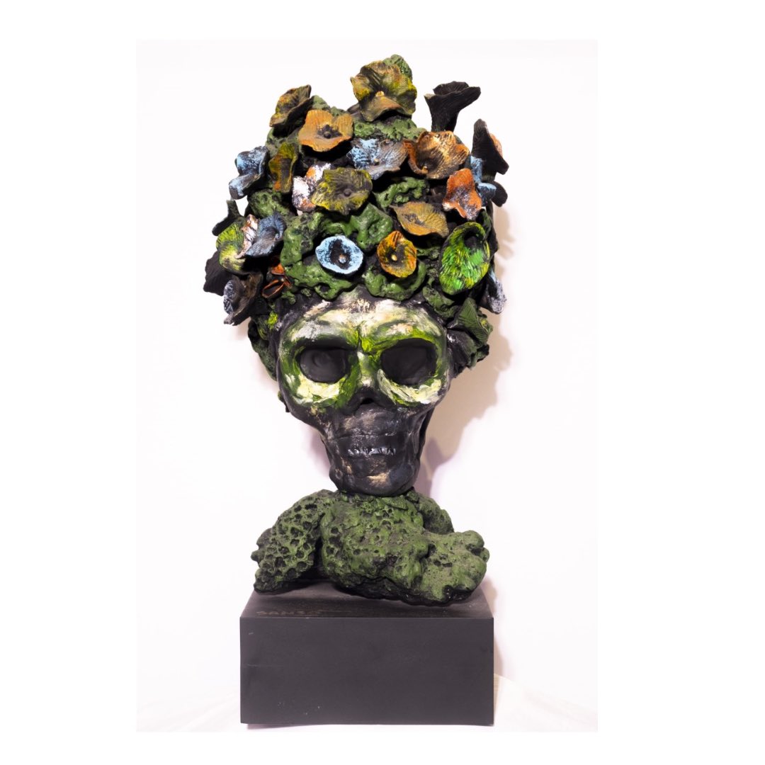 Fundacion Sansó elaborates, “Each artist’s interpretation and exploration of the skull theme are varied and unexpected, ranging from kinetic sculptures, traditional painting, an explosion of color and material, and a deconstruction of form. In this show, the artists “rebirthed” the skulls into something totally different.”