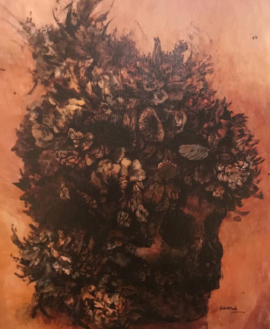 They add that “during Sansó’s Black Period from the 1950s to the early ‘60s, while he was still coming to terms with his trauma from World War II, the artist was inspired by Baudelaire’s Artificial Paradise wherein one of the phrases described a human skull wreathed with flowers.”