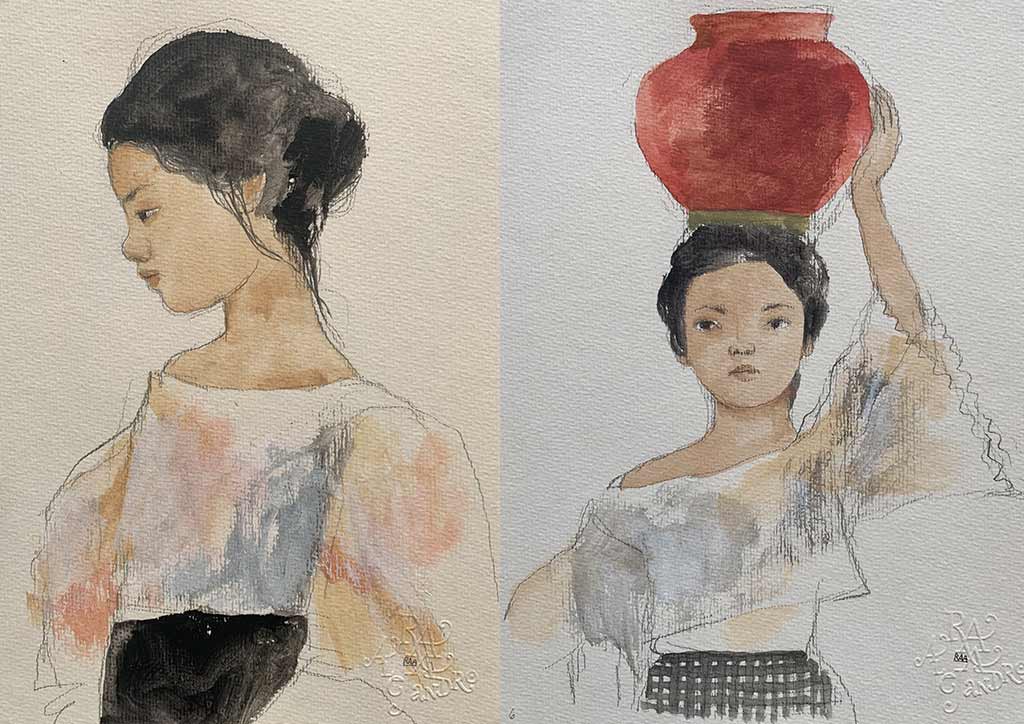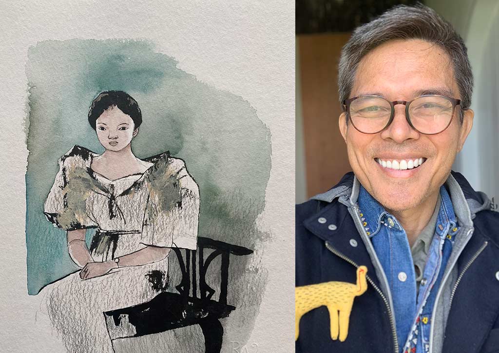 Delicate watercolors and mixed-media collages of Filipina women, in workday kimona or floaty Balintawak, are tawny skinned and dreamy. The subjects call to mind the romantic sepia photographs from that era, yet the spare lines these are rendered in show the strong Filipina spirit within.