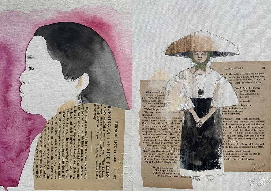 Delicate watercolors and mixed-media collages of Filipina women, in workday kimona or floaty Balintawak, are tawny skinned and dreamy. The subjects call to mind the romantic sepia photographs from that era, yet the spare lines these are rendered in show the strong Filipina spirit within.
