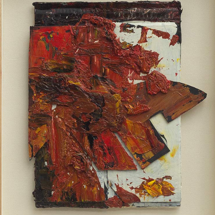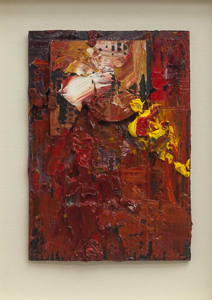 A 15 piece series of smaller framed collages smothered in layers on layers of glossy red are also included in the show.