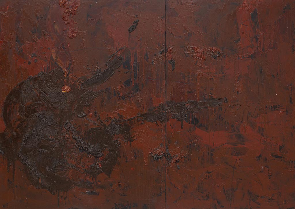 Another canvas has the shade of weathered red seen in temples, the color used by ancient religions to ward off evil spirits. Within each work are glimpses of lighter colors layered earlier in the process of abstraction with spots of orange, yellow and even gray peeking through.