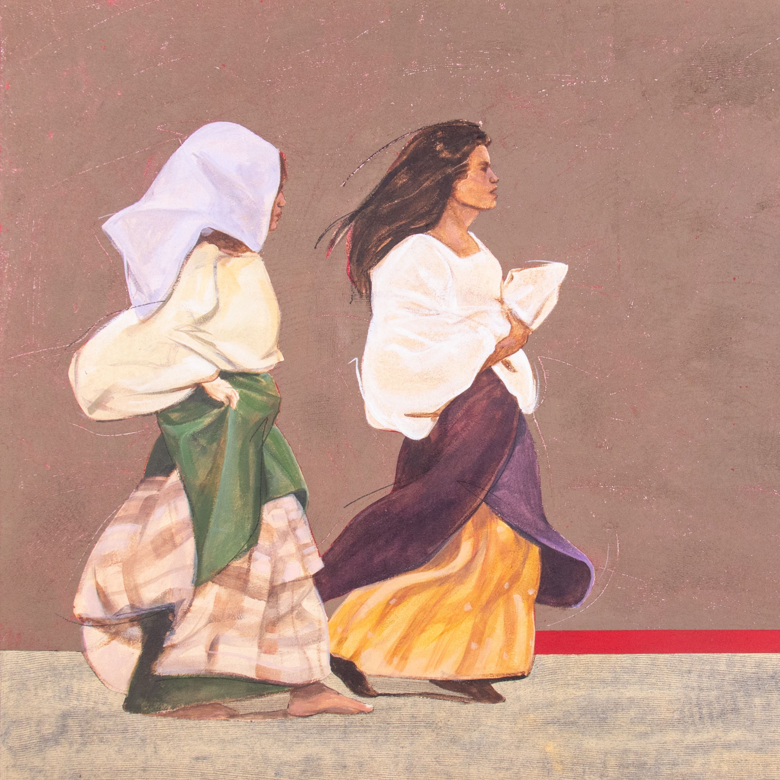 The painting features two women walking forward, with their hair and baro’t saya flowing with the wind. The scene portrays a sense of empowerment, as the figures walk with their chins held high.