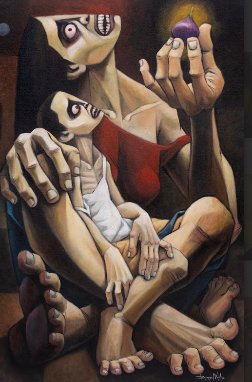 The pieces in Vista’s latest exhibition utilize what he calls a newer, more realistic technique, evoking a softer, painterly style that’s different from the bolder lines in his older work. Golden rice fields, quiet afternoons spent with family, and loving gestures are at the heart of Countryside Chronicles, showcasing that quintessentially Filipino warmth and hardworking spirit. Yet there’s also an edge to his pieces, with two in particular standing out as darker illustrations (“Minumurang Sibuyas” and “Minamahal na Bigas“)—ones he made to express his frustrations with the skyrocketing prices of onions and rice.