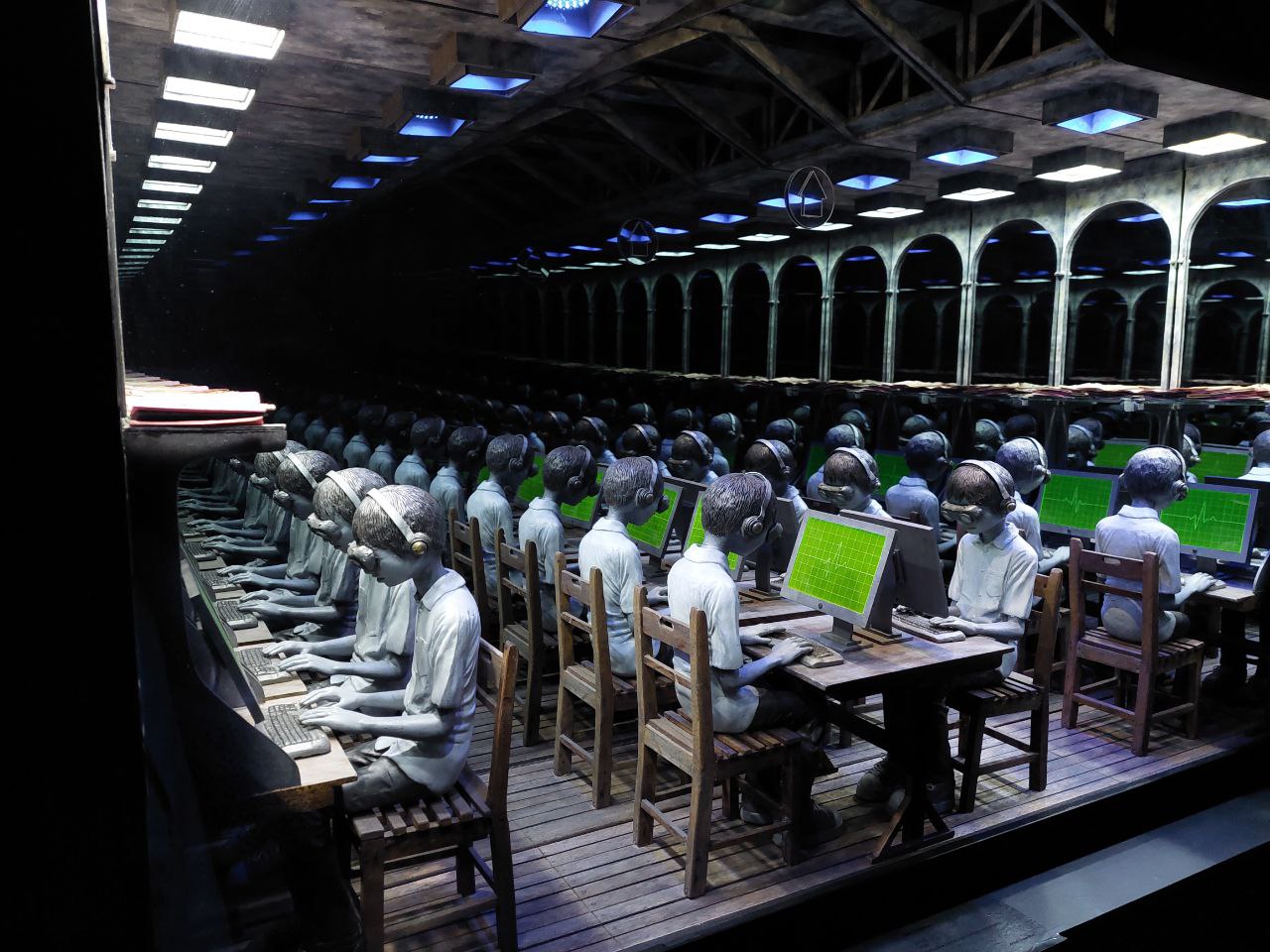 A stunning example was Mark Justiniani, who moved from 2D oil painting (see “Last Trip” pictured above) to sculptures—more specifically, intricate works that utilize mirrors to cast an infinite illusion, furthering the concepts they explore (such as the chilling and bleak “Online” pictured above).