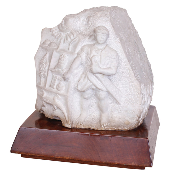 Napoleon V. Abueva (1930 – 2018), Code of Kalantiaw, signed and dated 1977 (lower right) white marble on wooden base. Marble: 13″ x 12″ x 11″ (33 cm x 30 cm x 28 cm), base: 4″ x 15 1/2″ x 13 3/4″ (10 cm x 39 cm x 25 cm).