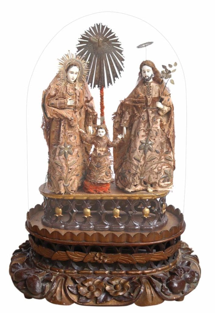Two religious icons are also included in the lineup: the Bulto of Maria Magdalena from the Benito J Legarda Jr Collection is an enigmatic 36-inch tall 17thcentury hardwood image of the kneeling santo with long flowing hair. The Sagrada Familia, on the other hand, is on a baticuling stand and encased in a virina.